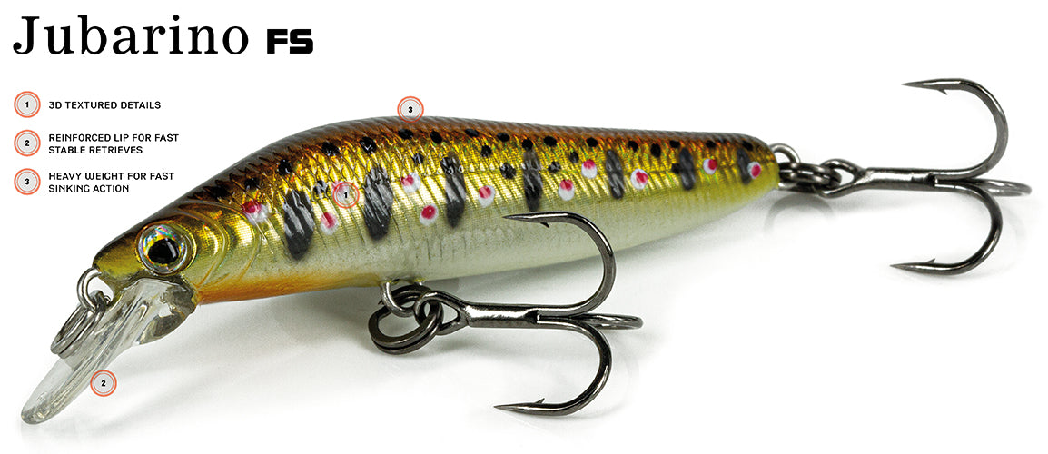 Finesse jerkbait fast sinking con un originale movimento atipico, estremamente adescante. Il Jubarino FS si lancia facilmente grazie al peso maggiorato e consente di esplorare con successo gli strati sub-superficiali e di media profondità. Ben bilanciato durante i recuperi costanti, mantiene un nuoto del tutto naturale anche in correnti forti o con recuperi veloci. Nei fiumi, laghi e nelle acque con corrente sostenuta, jerkato con piccole pause può essere letale, eccellente nella pesca delle trote.